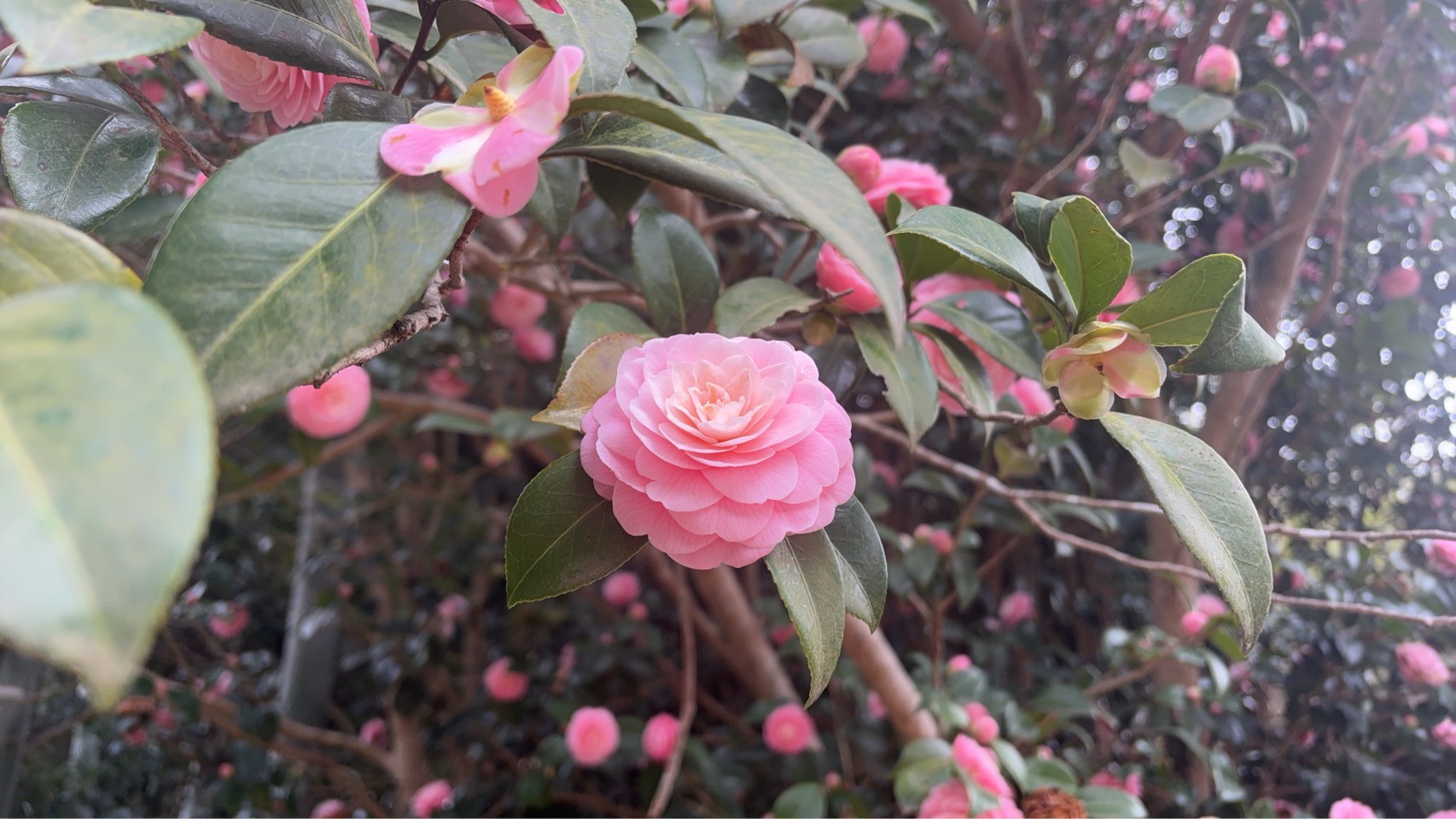 乙女椿は花びらを幾重にも重ねて、山桜は散り始めました。